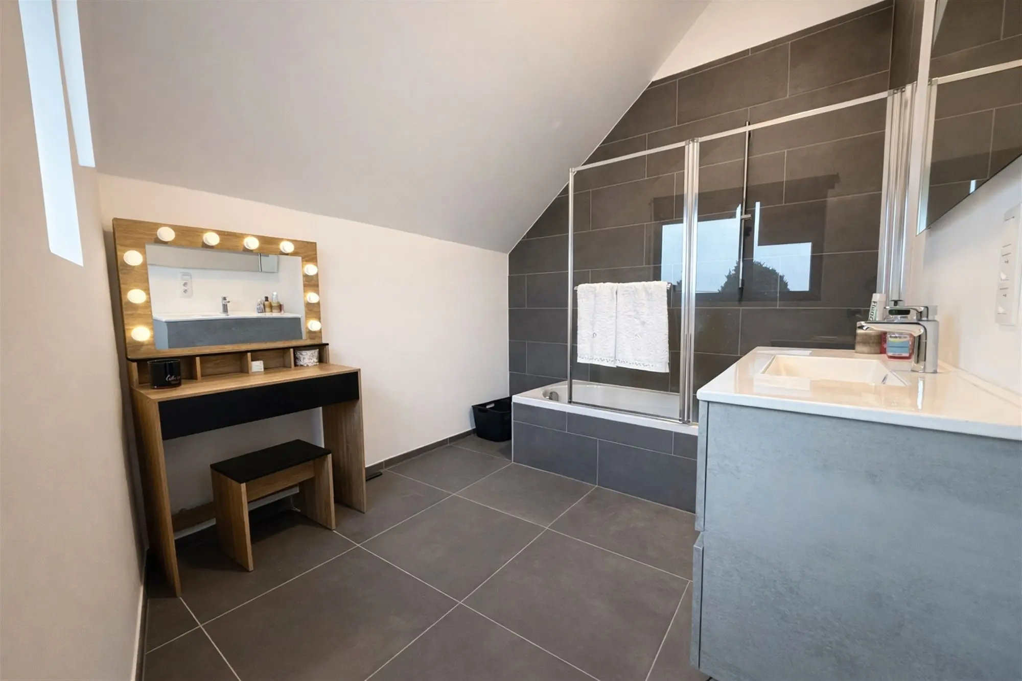 Une grande salle de douche, un wc et une buanderie complètent cet appartement utilisant toute la surface du dernier étage du bâtiment.