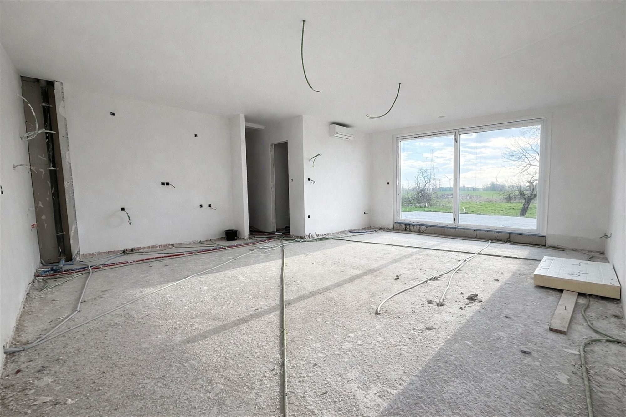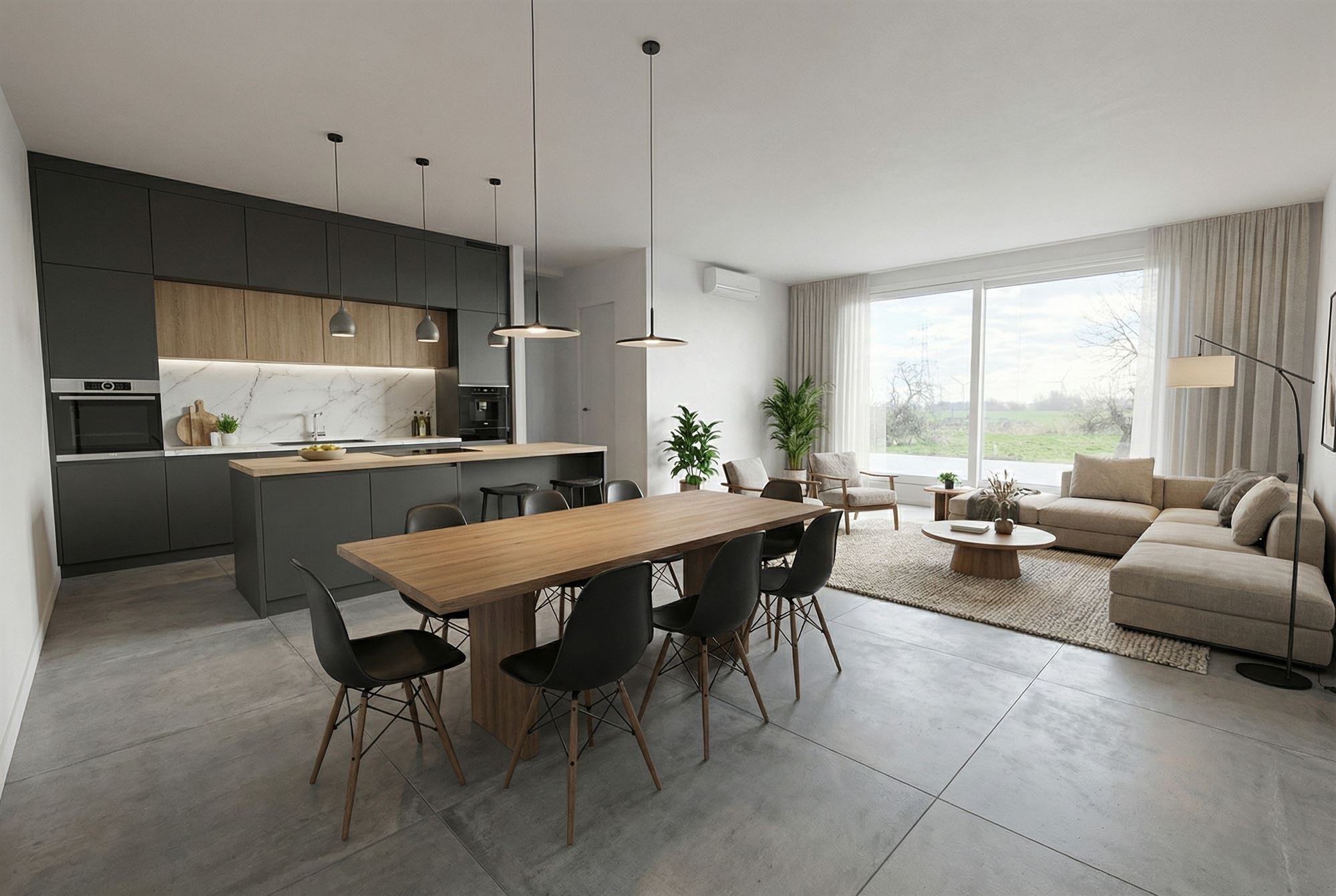 Un hall d'entrée menant vers le spacieux living lumineux avec une cuisine ouverte équipée.