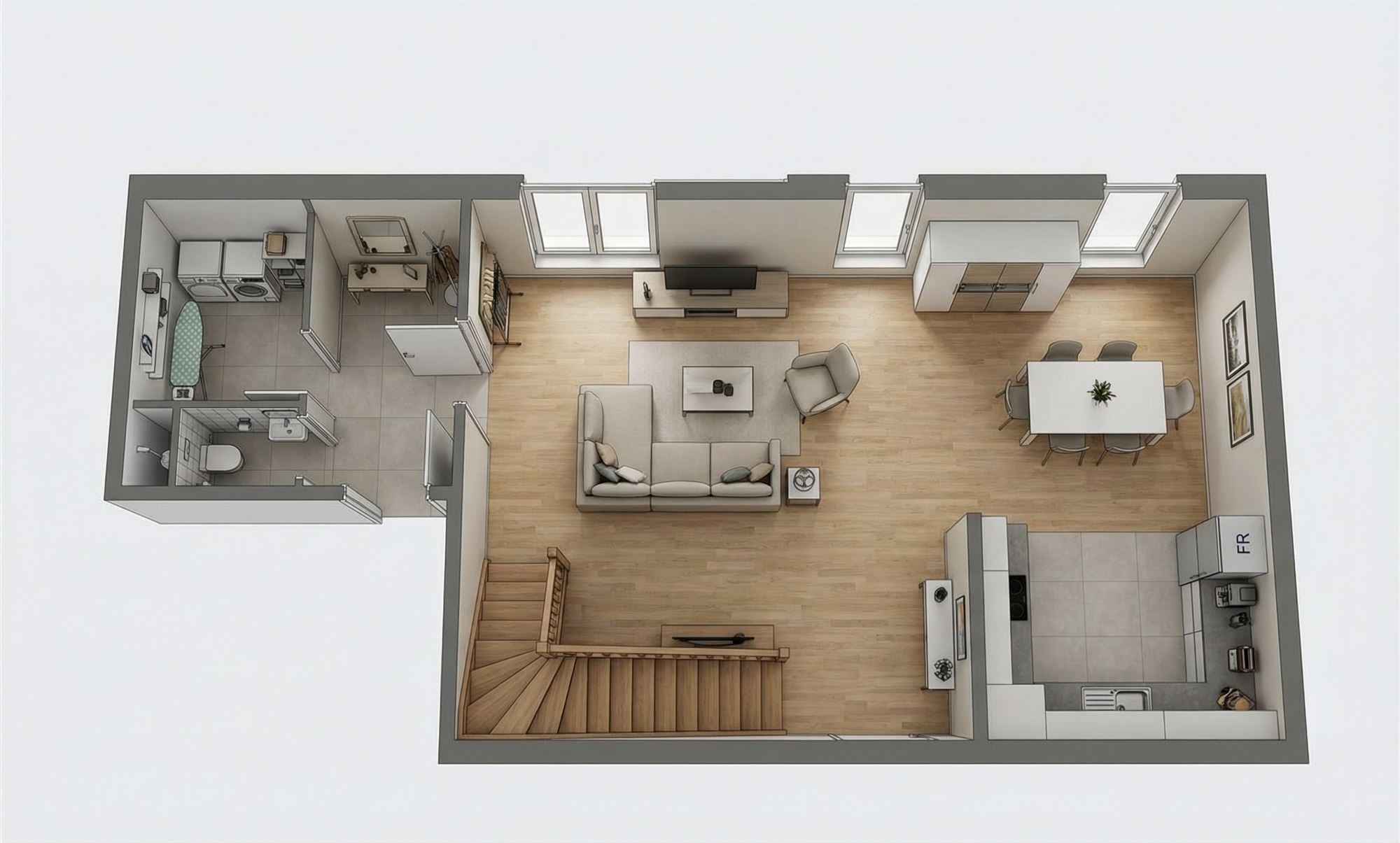 Au rez-de-chaussée, un hall d'entrée menant vers le spacieux living avec une cuisine hyper-équipée, une toilette séparée et une buanderie.